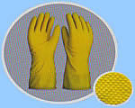 Descripción: guante de látex, interior flockado, con relieve; su resistencia al ataque de detergentes y ácidos los hace de utilidad en las más variadas tareas, su película de espesor uniforme, sin poros o zonas débiles, ni tampocogrumos de gotas, los hace resistentes y elásticos.
